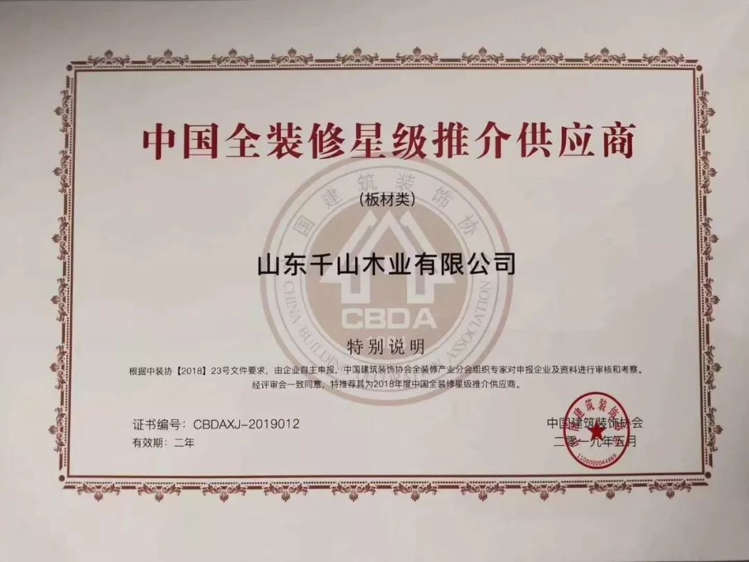 2019年5月,千山憑借高質(zhì)量的產(chǎn)品、良好的信譽(yù)成功入圍由中國(guó)建筑裝飾協(xié)會(huì)主辦的2018年度《全裝修供應(yīng)商推介目錄》企業(yè)名單及《全裝修星級(jí)供應(yīng)商推介目錄》。