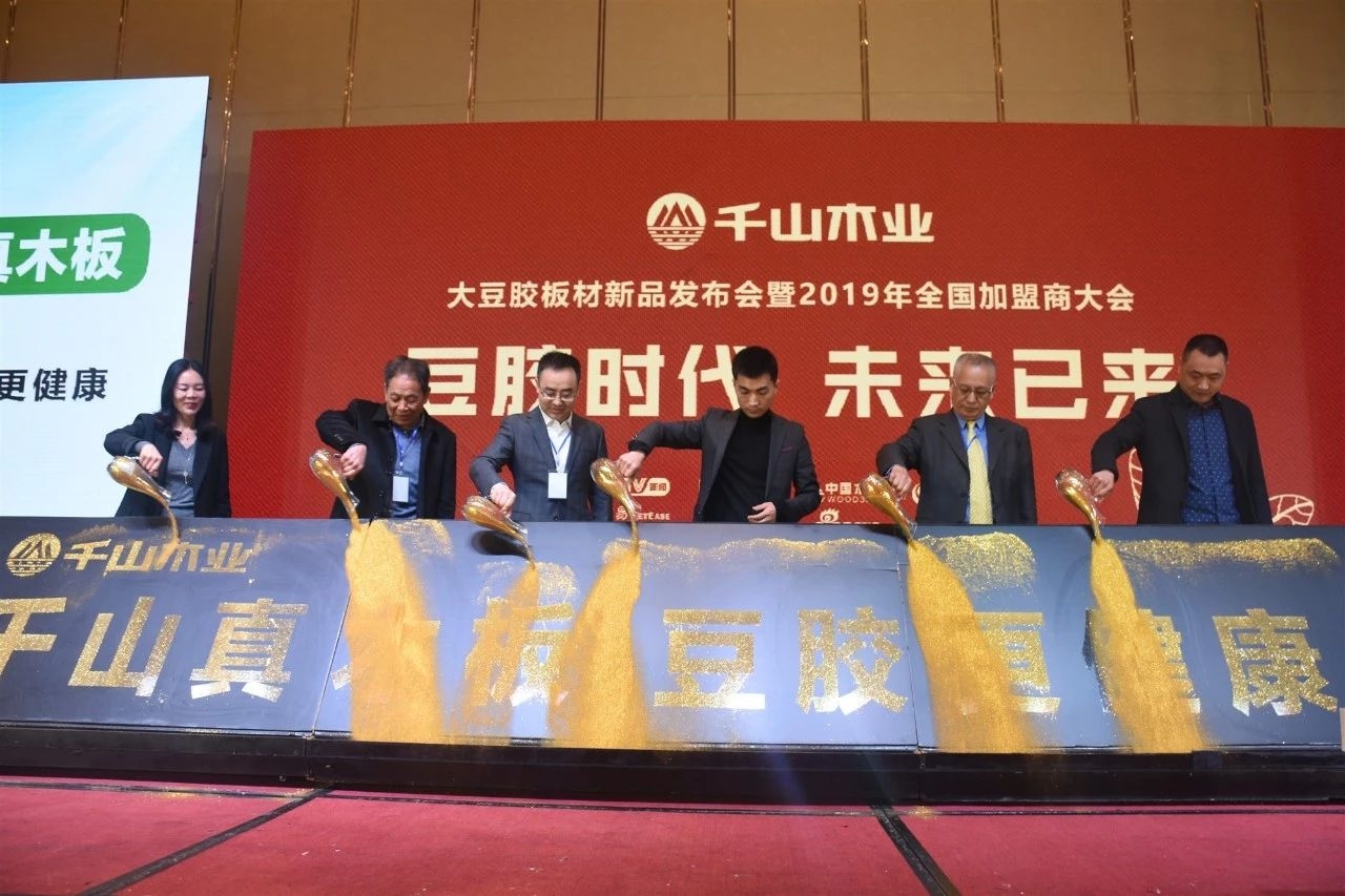 2019年3月21日,在板材之都山東臨沂舉行了“豆膠時(shí)代·未來(lái)已來(lái)”新品發(fā)布會(huì)暨2019年全國(guó)加盟商大會(huì)。千山大豆膠板材成功上市,意味著板材行業(yè)由脲醛膠E0級(jí)時(shí)代跨入植物豆膠新時(shí)代!