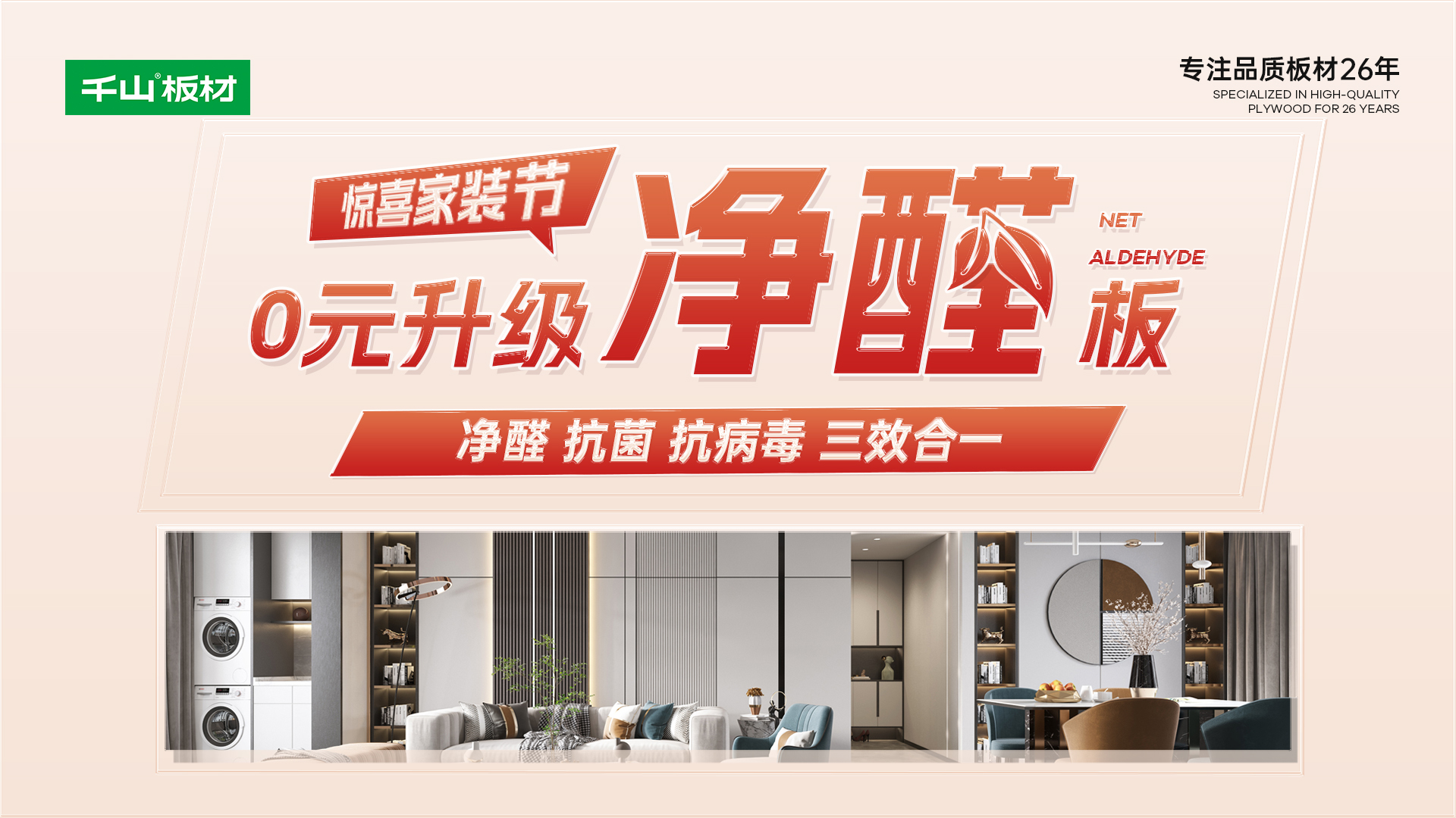 千山板材新一代凈醛板推出后,以凈醛、抗菌、抗病毒三效合一強勢出圈,受到眾多消費者的關注和咨詢。此次家裝節千山板材特別推出0元升級凈醛板福利,王炸產品,全面升級,助力有品青年享受高凈家居生活!