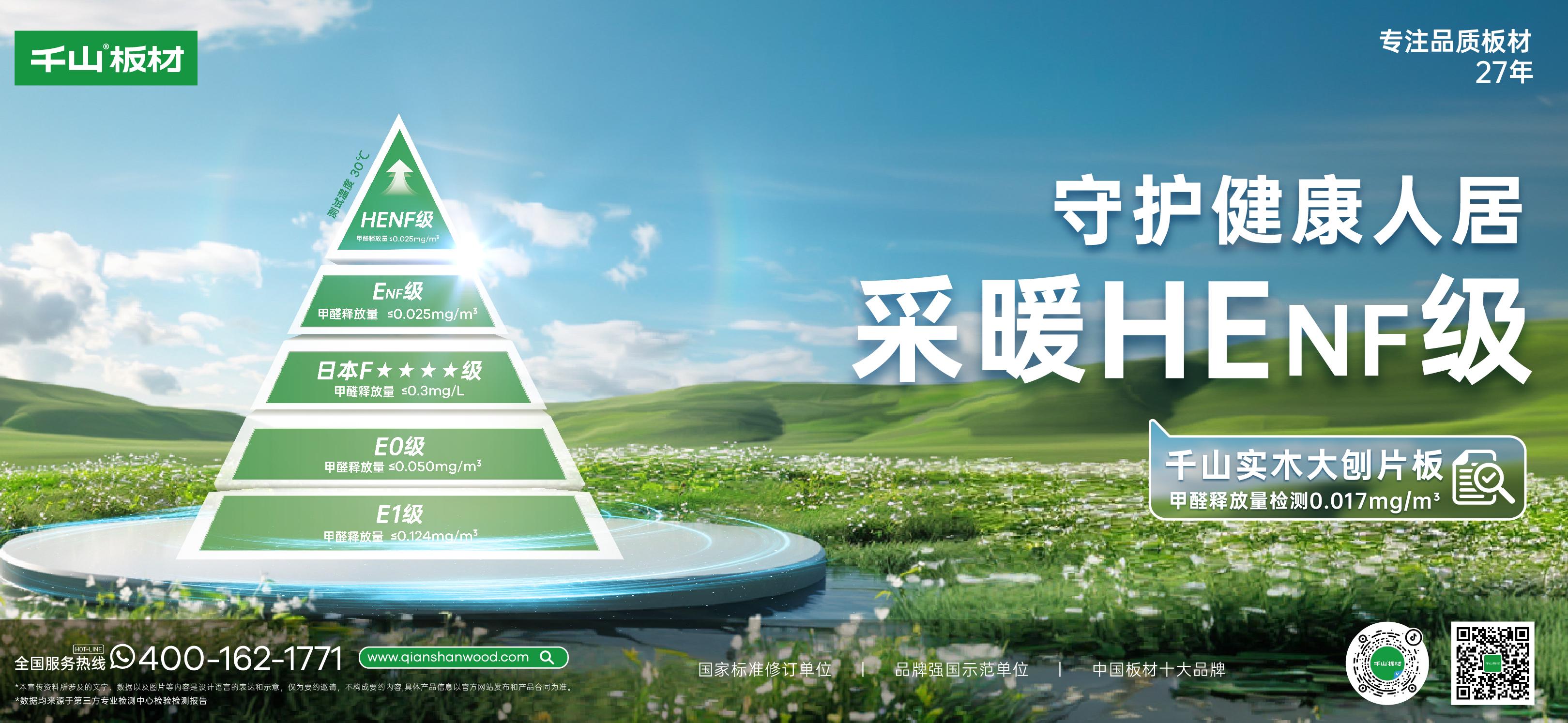 傳統板材環保標準多聚焦于常溫環境下的甲醛釋放量,而HEnf級的甲醛釋放量在30℃熱環境下被嚴格限制在0.025mg/m3以內,是中國林產工業協會于2022年5月31日發布的《采暖用人造板及其制品中甲醛釋放限量》(T/CNFPIA 1003-2022)標準中的最高等級。HENF級:環保的升級躍遷千山板材四大品類: