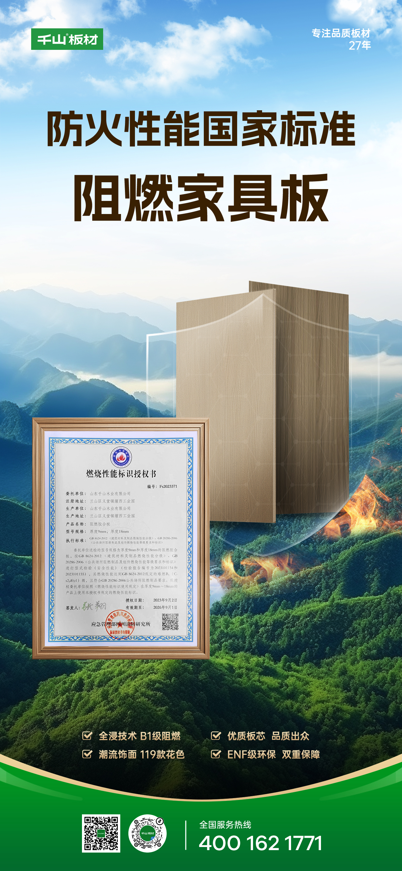 從“符合標準”到“主動防護”,板材安全性能成為大家極為關注的重要指標,特別是在家庭環境中,健康和安全是首要考慮因素。千山阻燃家具板,將科技飾面與安全阻燃技術相融合,為家居空間“抵抗力”加分。千山阻燃家具板,具有專業防火阻燃性能,能夠抵御火災威脅,為我們的家居空間筑起一道安全防護墻。 #1 全
