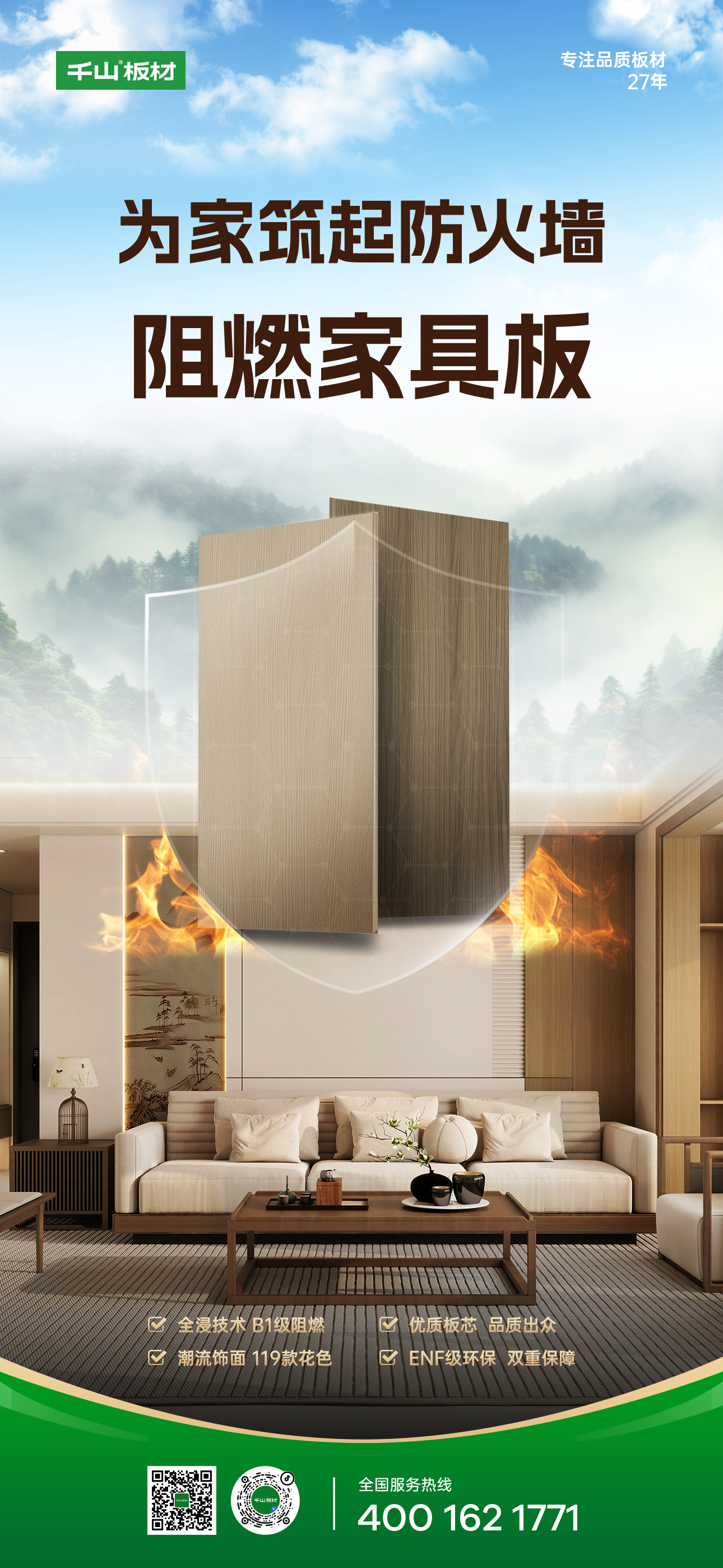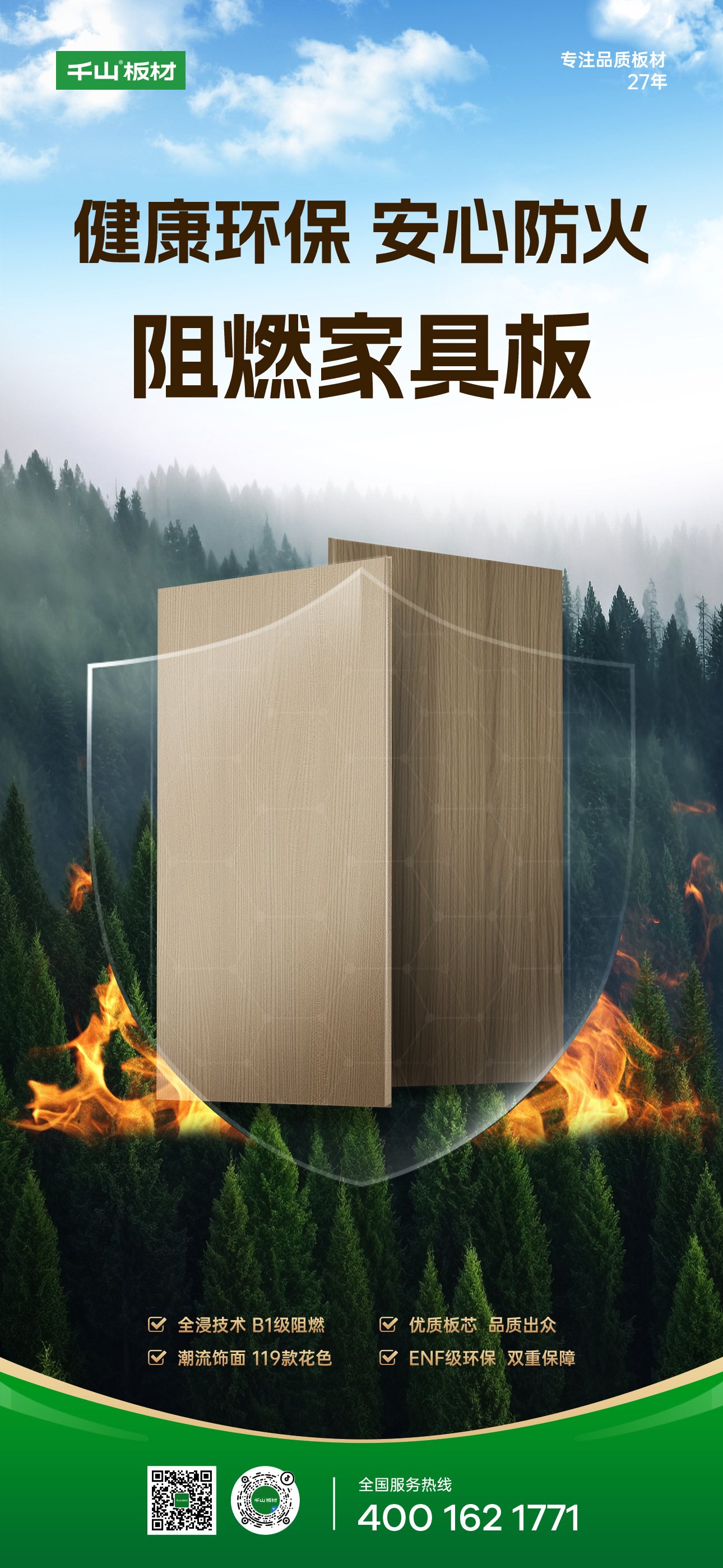 千山阻燃家具板,憑借卓越的品質和出色的阻燃性能,成為現代家居裝修中不可或缺的安全保障,構筑起家居空間安全防線,守護每一個家庭的幸福時光!