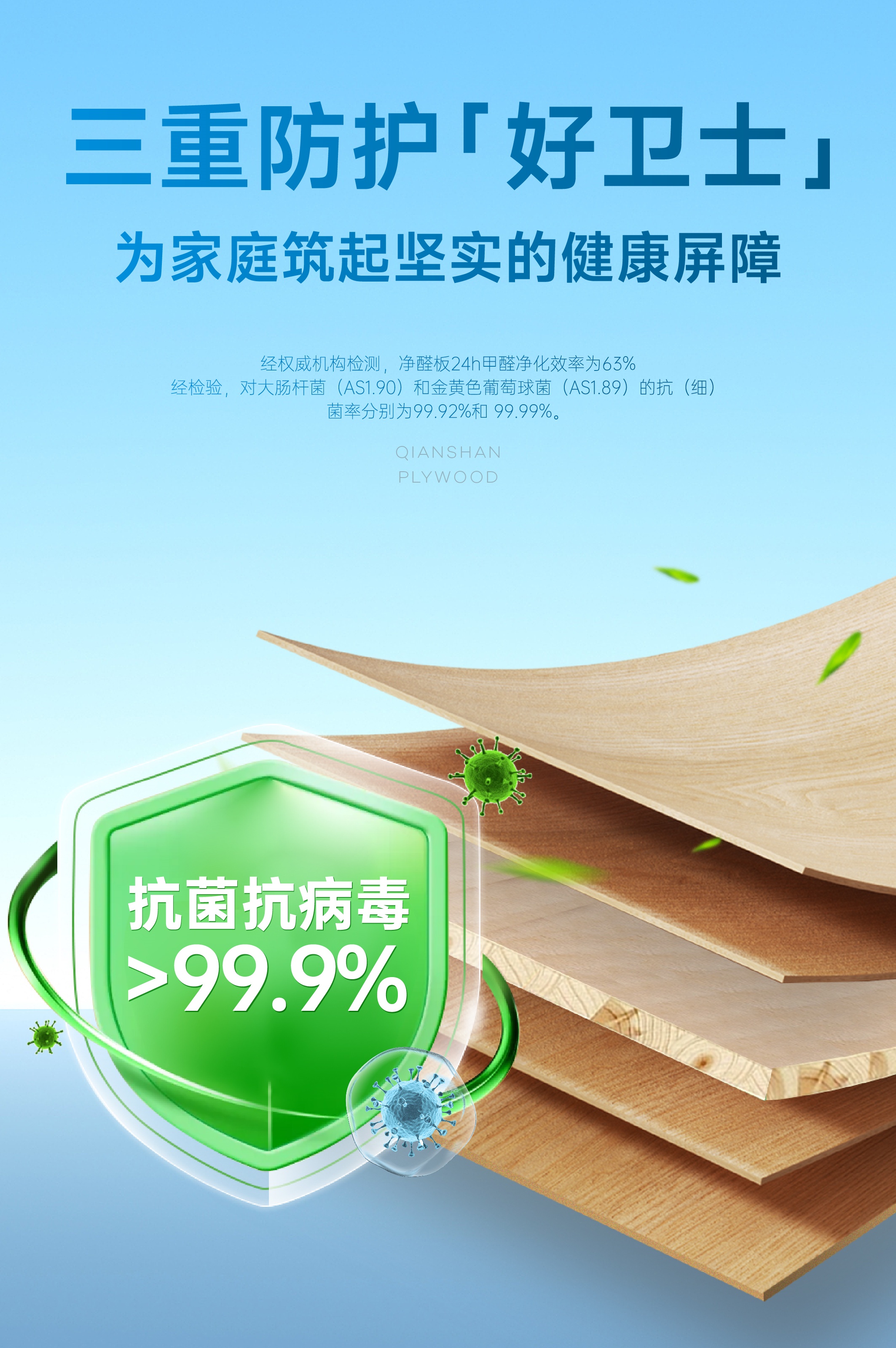 在HENF級和F4星雙環(huán)保標(biāo)準(zhǔn)之上,千山板材具有凈醛、抗菌、抗病毒三重防護(hù)。經(jīng)權(quán)威機構(gòu)檢測,凈醛板對大腸桿菌(AS1.90)和金黃色葡萄球菌(AS1.89)的抗(細(xì))菌率分別為99.92%和99.99%。對甲型流感病毒H1N1的抗病毒活性率為>99.9%。